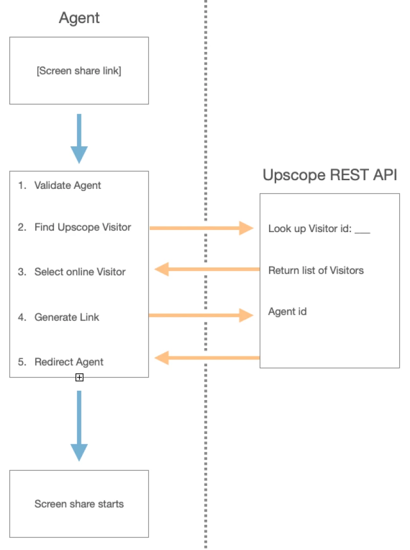 At present, when a support agent clicks the Upscope screen sharing link, it will open up a new tab under the Upscope domain to allow you to screen share. You might not wish to do that. You can instead embed the Upscope screen sharing session directly within your system.