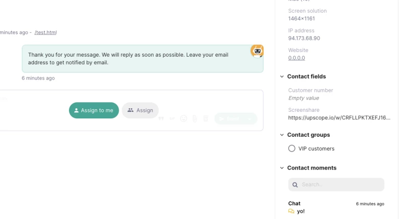 So when Trengo loads on the page for a customer, Upscope generates a unique screen sharing link and passes that into Trengo. Once the customer asks for help and the agent opens the chat box, they'll see that screen sharing link appear in the Trengo interface.