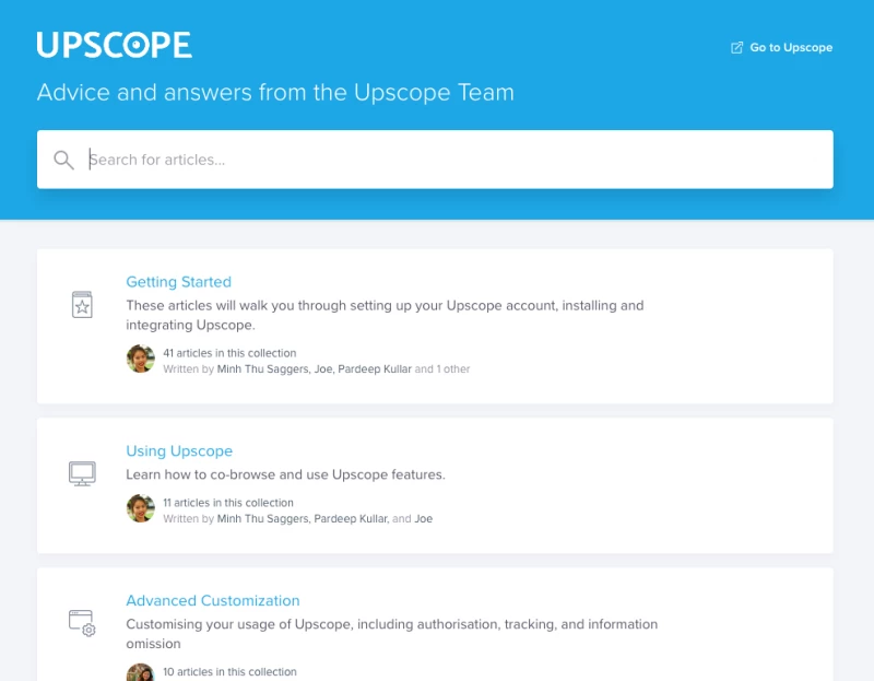 At Upscope we use Intercom Articles as our knowledge base. It's integrated directly into our live chat so that we can send a knowledge base article to a customer with an issue. They can search for that article themselves.