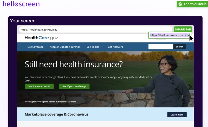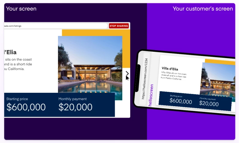 Our Co-Browsing extension will share your browser tab to your client's phone (or pc) in 5 seconds.